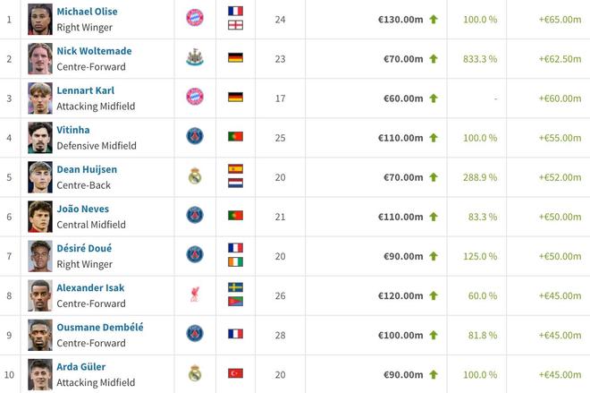 9. 登貝萊(巴黎圣日耳曼) +4500萬(wàn)歐元(+81.8%) 1億歐元